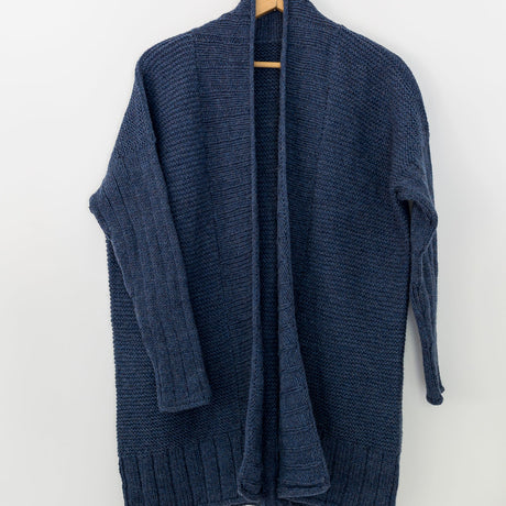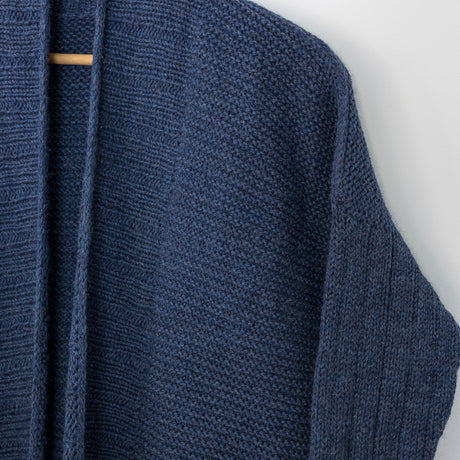 Le vêtement est tricoté du haut vers le bas, en point mousse, les mailles sont relevées pour tricoter les sections en côtes plates. Les manches sont tricotées en rond, et le col surdimensionné, à plat. Les finitions simples et élégantes sont réalisées en dernière étape à l’aide de délicates bordures de type I-cord.